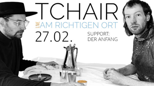 27.02.Fr..21:00 KonzertKonzert: TCHAIR + Der AnfangSeit er Argwohn und Scham der deutschen Sprache gegenüber verdrängt hat, legt TCHAIR sich selbst und anderen semi-experimentelle Poprocksongs in den Weg – wie musikalische Stolpersteine. Aber nicht zum Hinfallen, sondern zum Reinlegen.